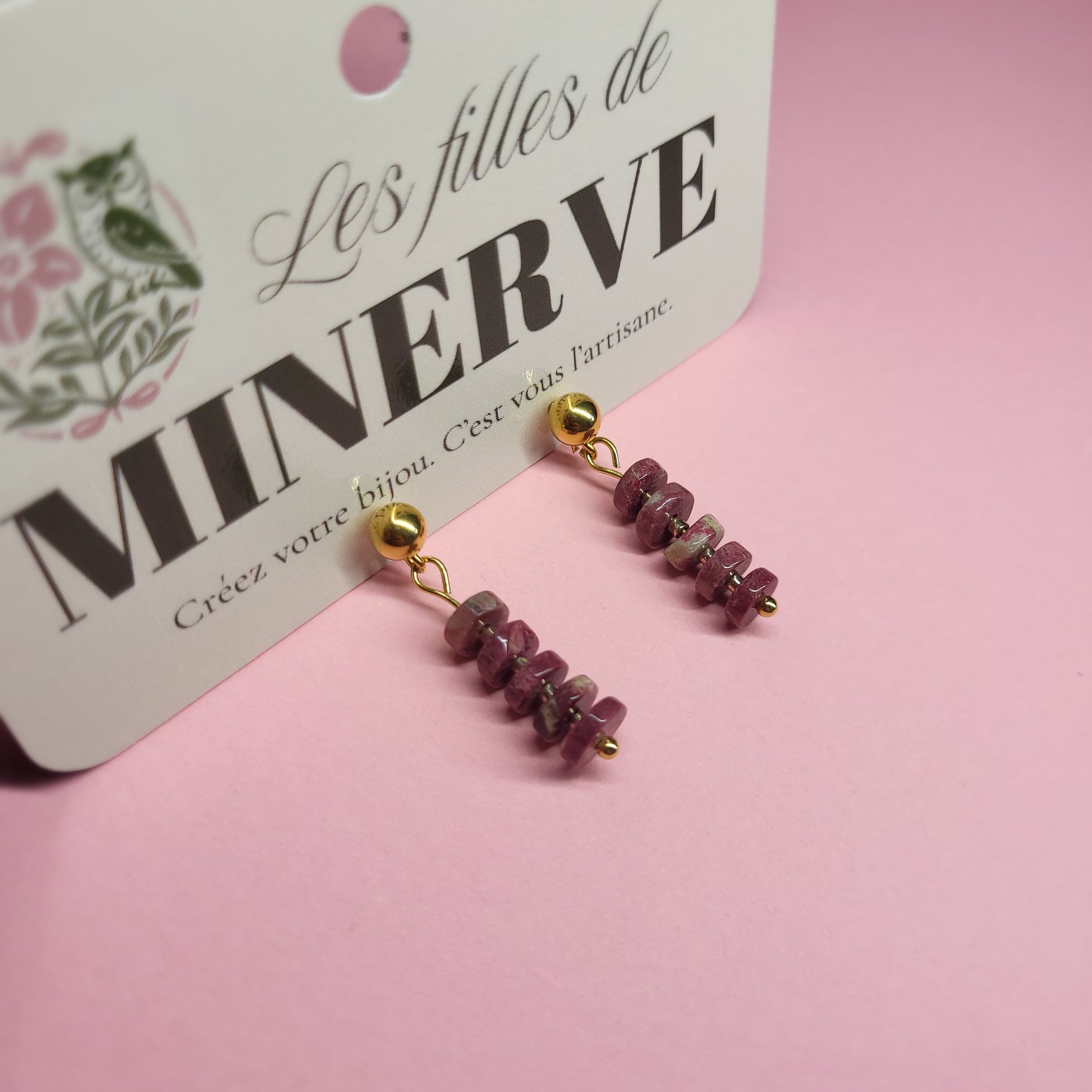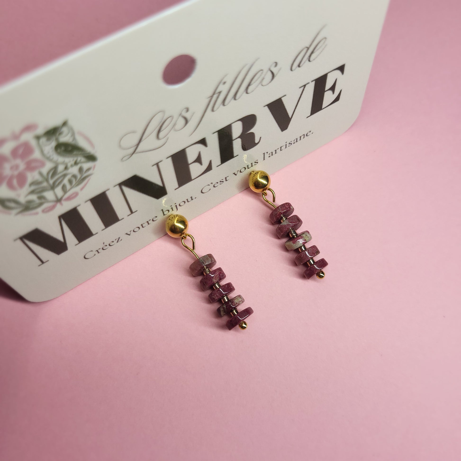 These earrings combine the elegance of stainless steel with the natural softness of rhodonite. Each genuine stone pendant is distinguished by its delicate shades of pink, sometimes marbled with grey or black, making each pair unique.