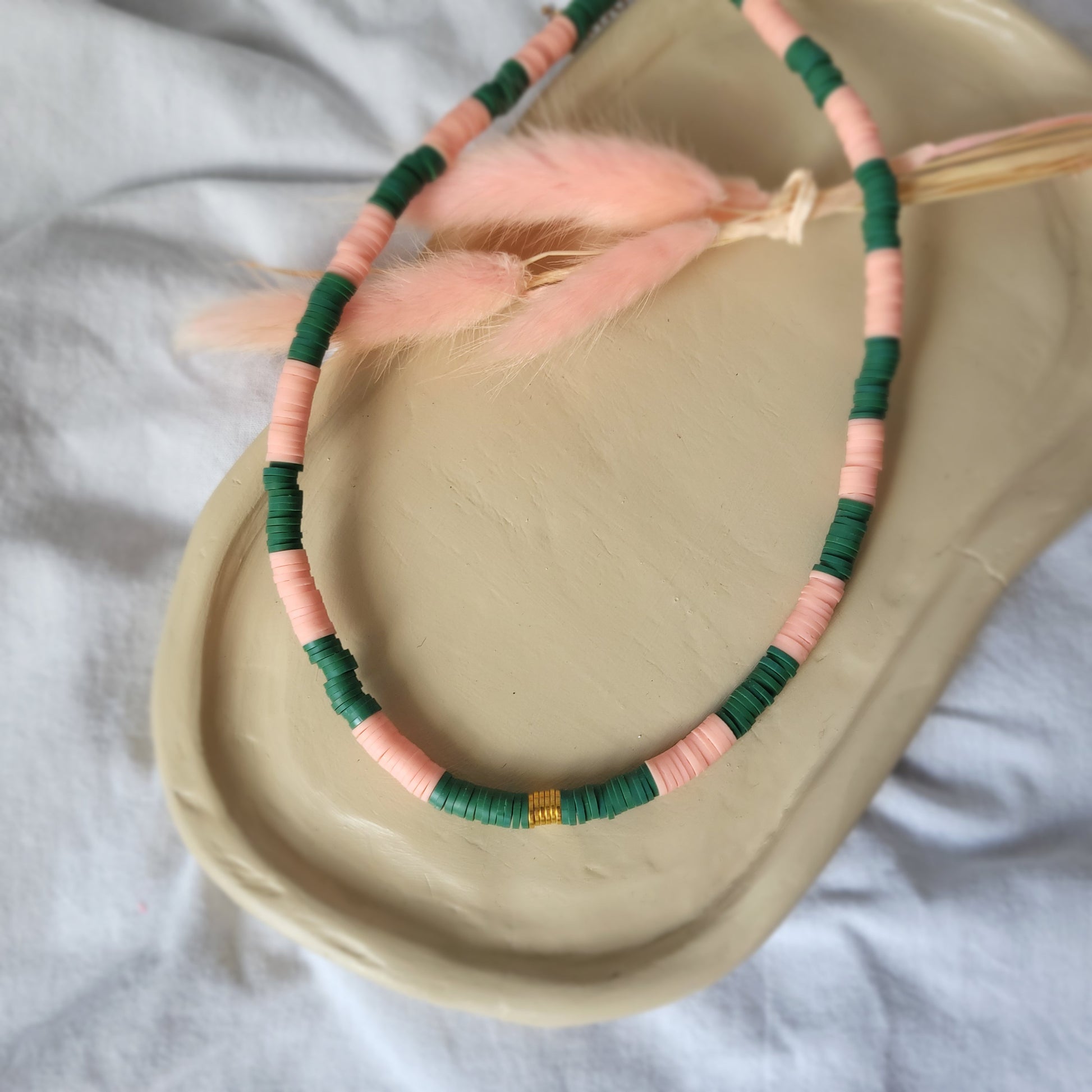 - Perles heishi vertes et roses en pâte polymère, associées à des perles dorées