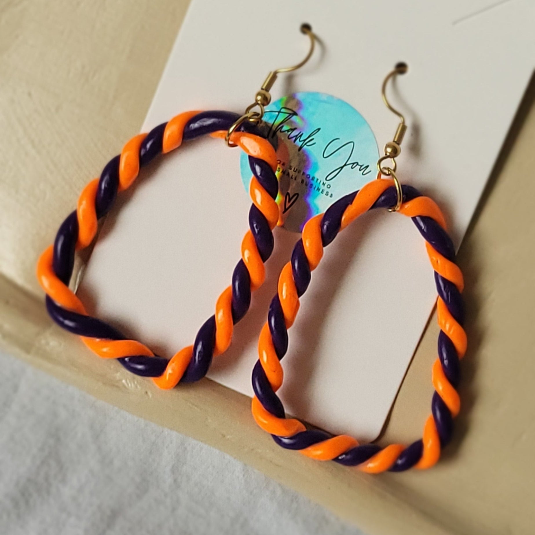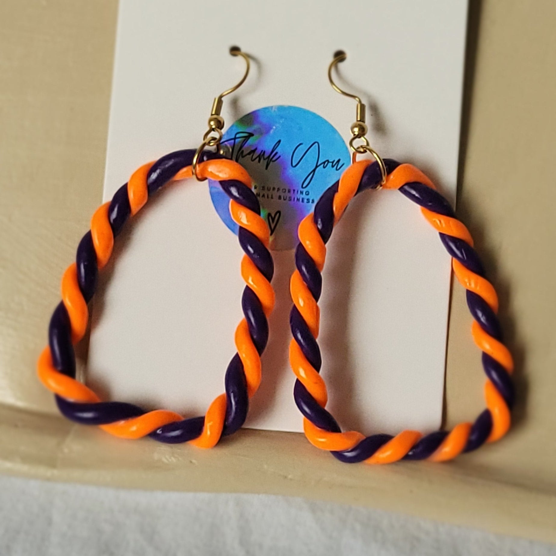 Originales et colorées, ces boucles d’oreilles jouent avec les formes et les textures : un carré en bas surmonté d’un haut arrondi, entièrement façonné à la main en pâte polymère. Leur design torsadé mêle les teintes chaleureuses de l’orange et les nuances mystérieuses du mauve, créant un bijou à la fois graphique et ludique. Légères et uniques, elles apportent une touche artistique et contemporaine à vos tenues.