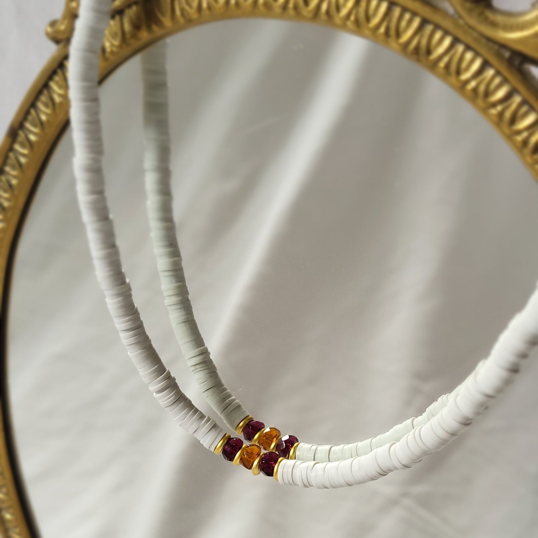 - Acier inoxydable, perles en pâte polymère, grenat véritable et ambre naturelle