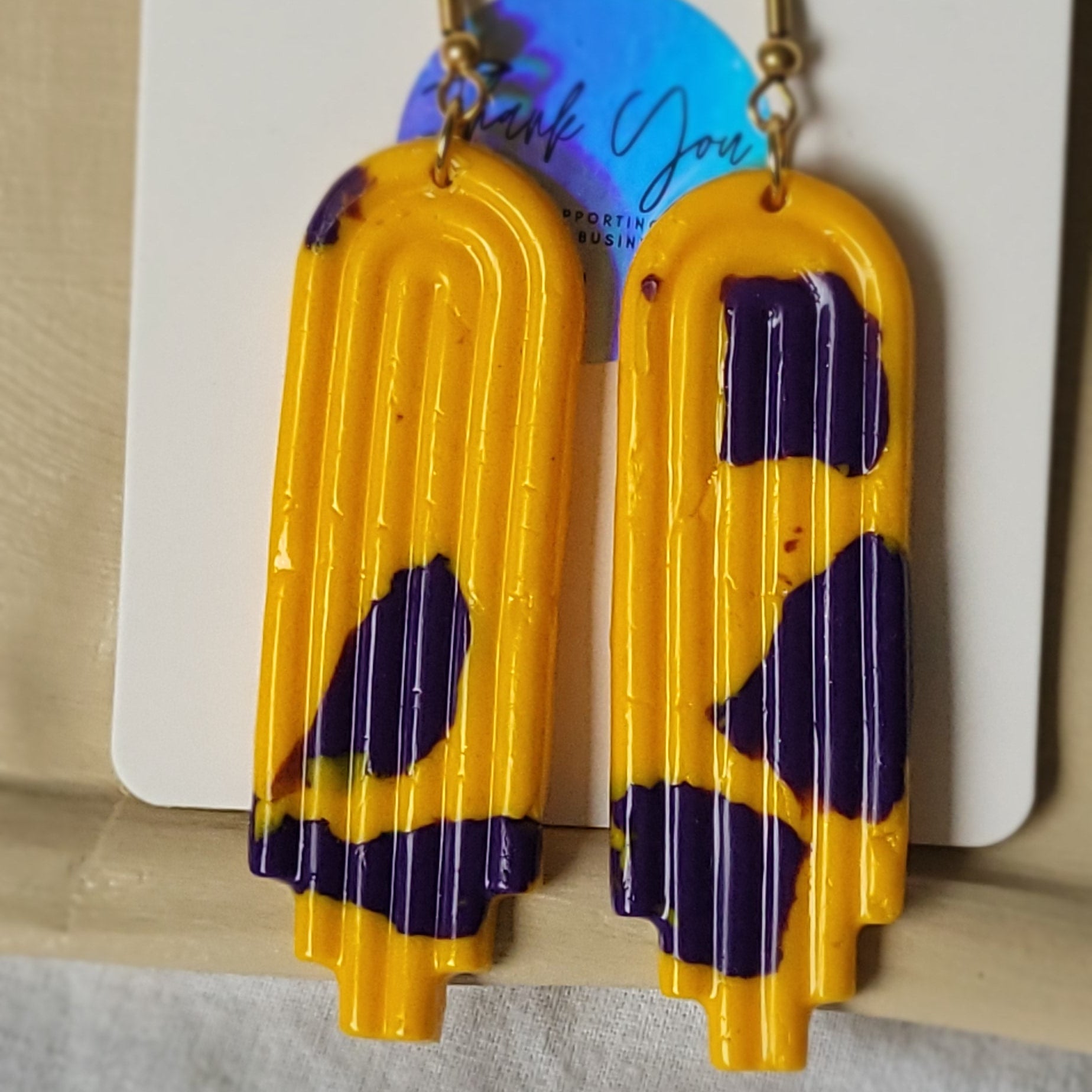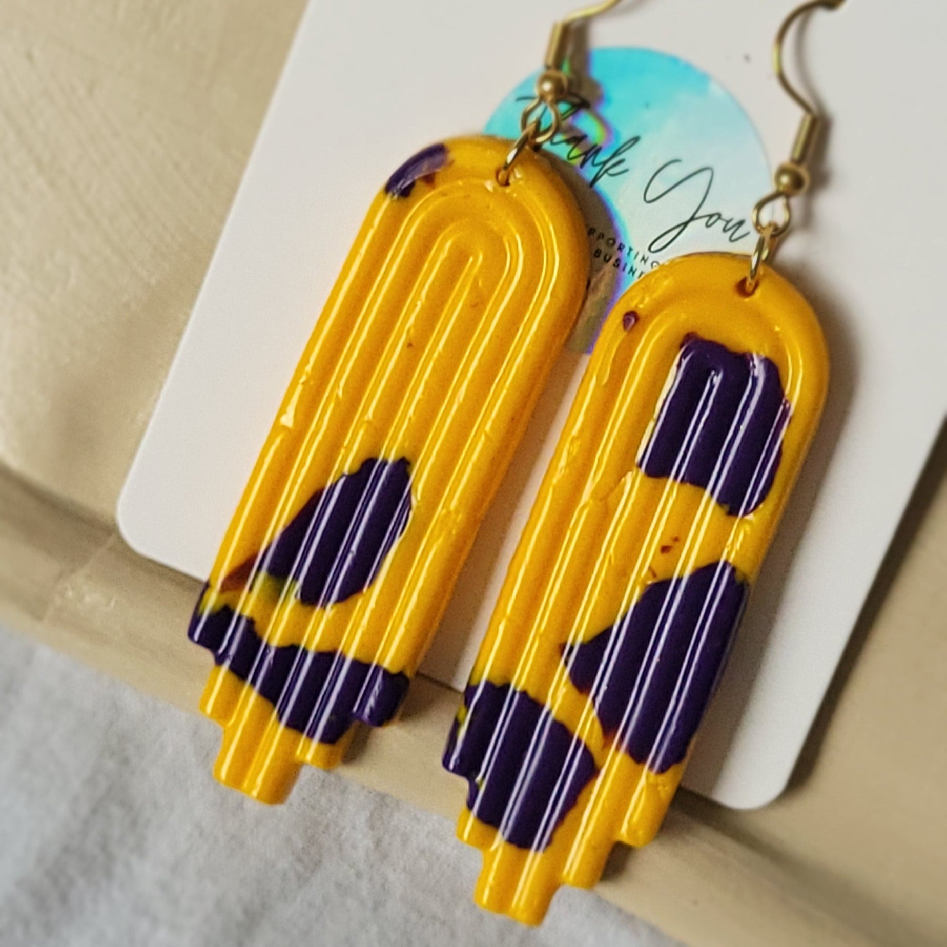 Les boucles d’oreilles Dalo jouent avec les couleurs et l’originalité. Réalisées en pâte polymère, elles se parent d’un jaune éclatant et acidulé, réveillé par de délicates touches mauves qui apportent contraste et modernité. Légères et confortables, elles illuminent le visage tout en apportant une note joyeuse et créative à chaque tenue. Fabriquées à la main, chaque paire est unique grâce aux motifs aléatoires et aux nuances propres à la polymère.
