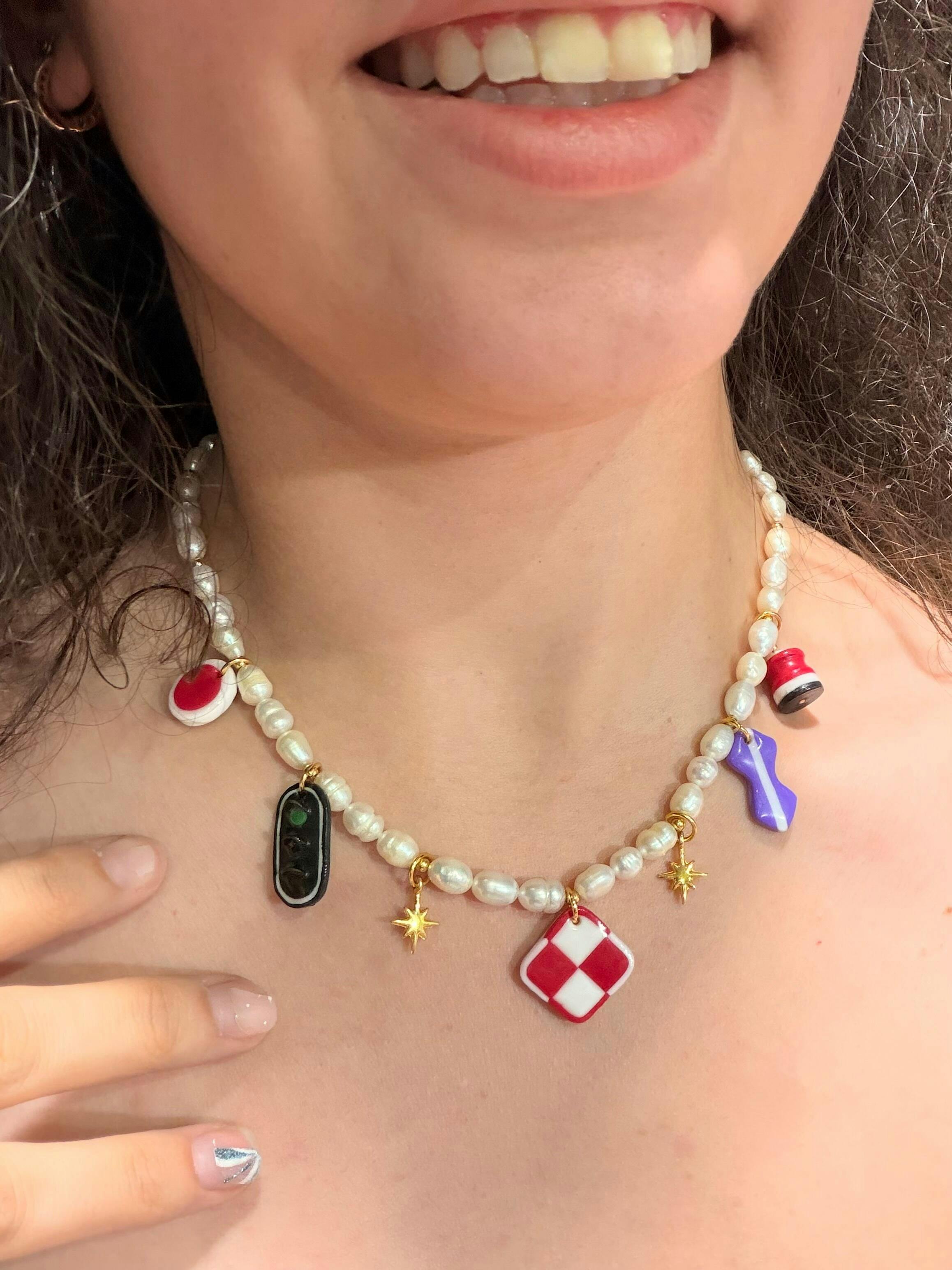 - 🦪 Perles de culture d'eau douce naturelles, acier inoxydable et charms en pâte polymère.