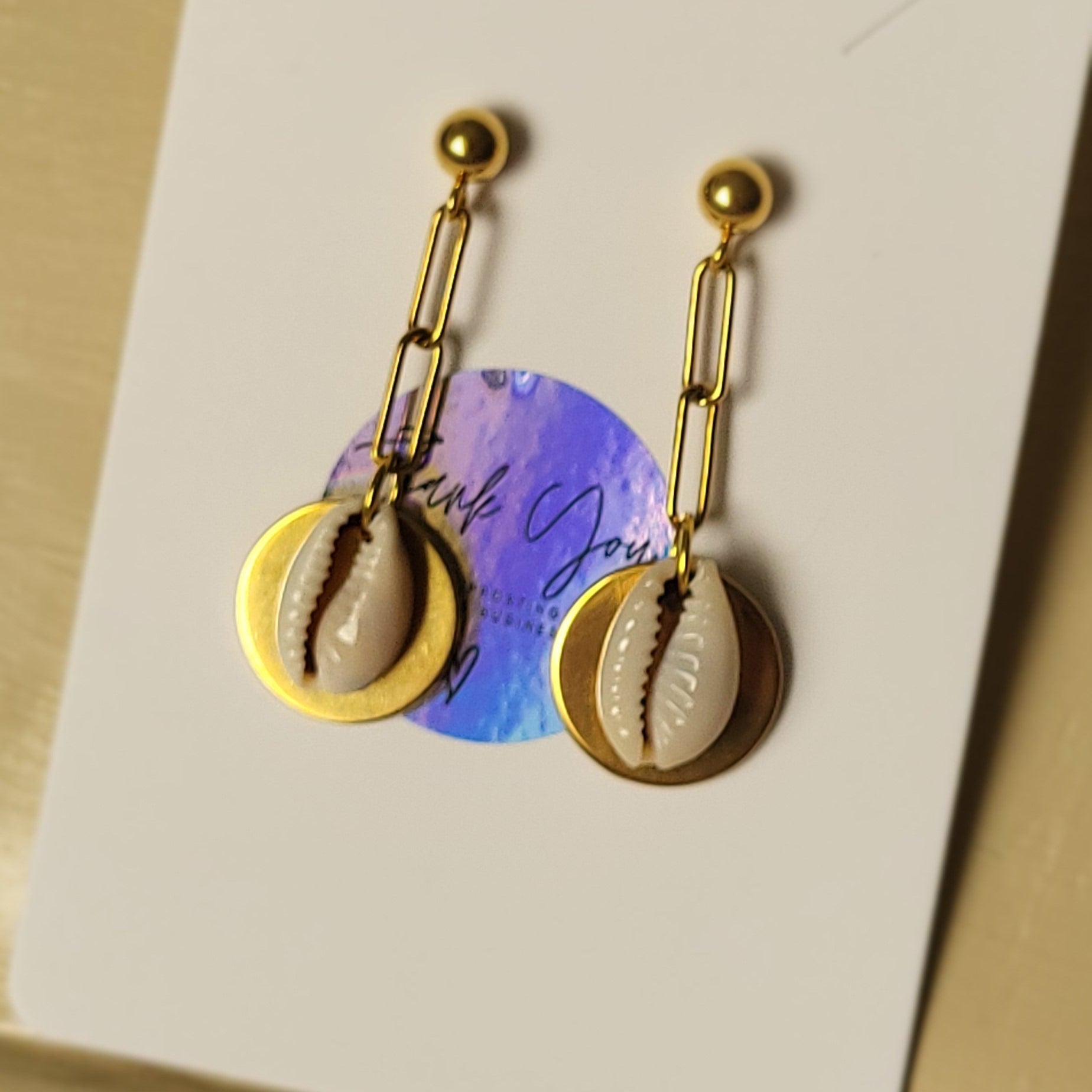 Ces boucles d’oreilles uniques associent finesse et naturel. Elles se composent d’une délicate chaîne en acier inoxydable doré, ornée à son extrémité d’un médaillon doré en acier inoxydable et d’un véritable coquillage. Un mélange harmonieux entre l’éclat du métal et la douceur de l’élément marin, qui apporte à chaque tenue une touche élégante et solaire.